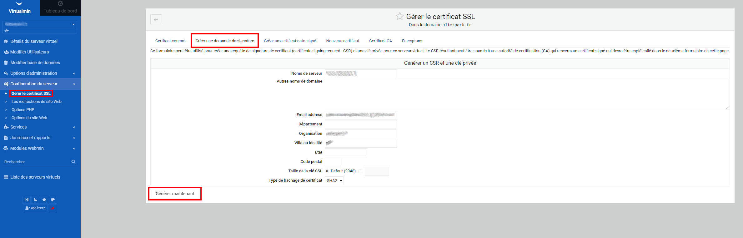 Allez dans 'Configuration Serveur', 'Gérer le certificat SSL'. Allez dans l'onglet 'créer une demande de signature'. Rentrez ensuite vos informations